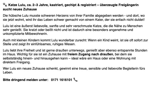Dies ist eine Vermittlungsanzeige, die wir auf Wunsch der Halter-Familie posten:
